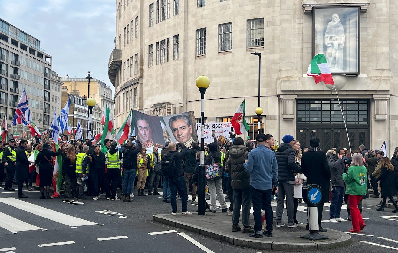 Here is an image from central London in January, for example, near the main BBC studio, as Reza Pahlavi’s supporters peacefully expressed their anger towards Khamenei’s regime and allegiance to the Pahlavi dynasty.